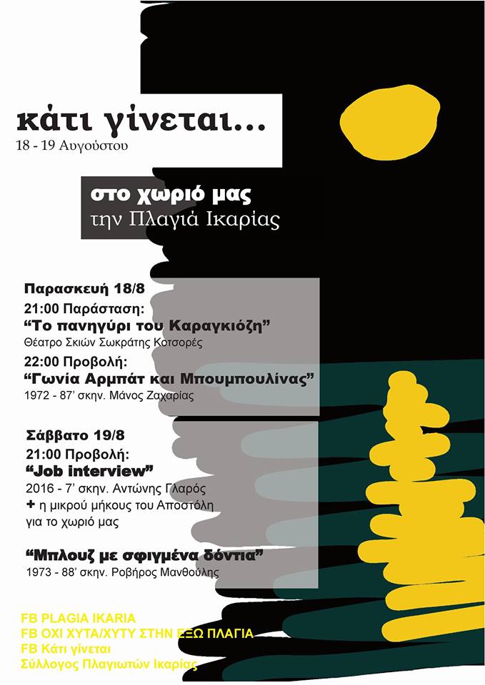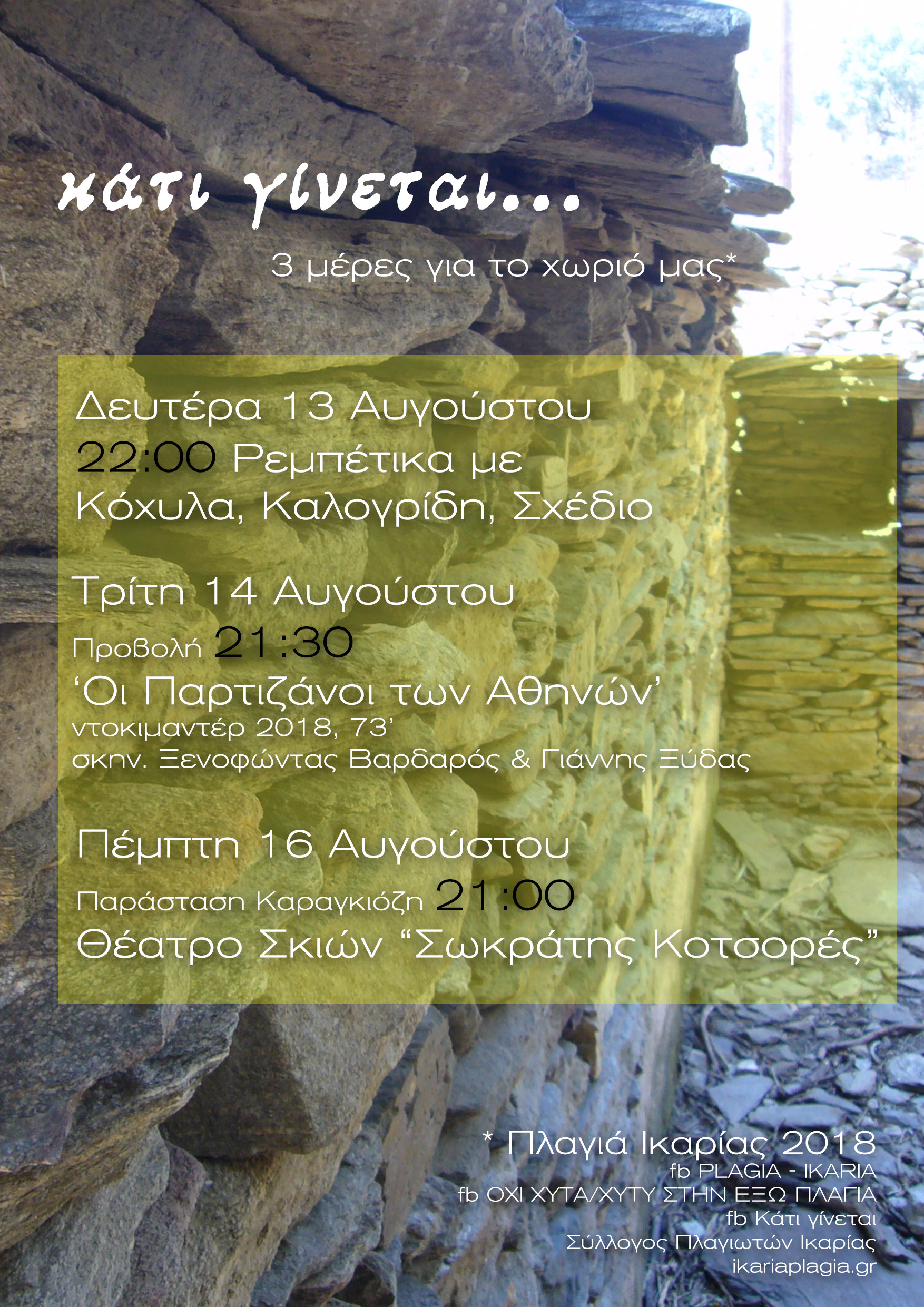 Από το 2012 και κάθε χρόνο λίγο πριν ή λίγο μετά τον δεκαπενταύγουστο συνδιοργανώνουμε ένα φεστιβάλ στην πλατεία του χωριού Πλαγιά στην Ικαρία το «Κάτι γίνεται…».